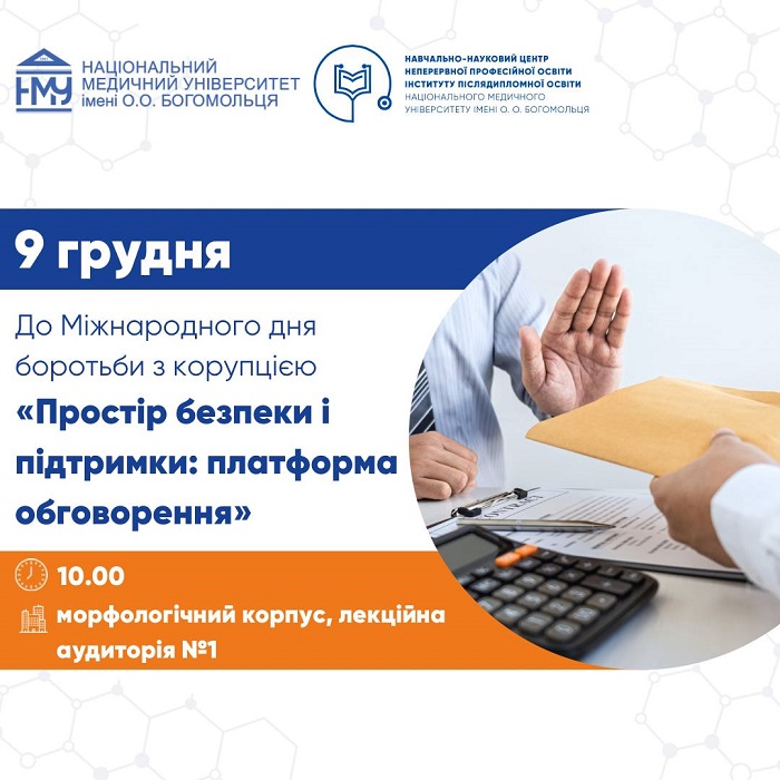 До Міжнародного дня боротьби з корупцією 9 грудня у Національному медичному університеті імені О.О. Богомольця відбудеться захід «Простір безпеки і підтримки: платформа обговорення», присвячений питанням рівності, протидії дискримінації, мобінгу, булінгу, насильству та корупції. Подія проводитиметься у межах міжнародної акції «16 днів проти насильства», організаторами виступають відділ навчально-методичної роботи, ліцензування та акредитації та Навчально-науковий центр неперервної професійної освіти НМУ.