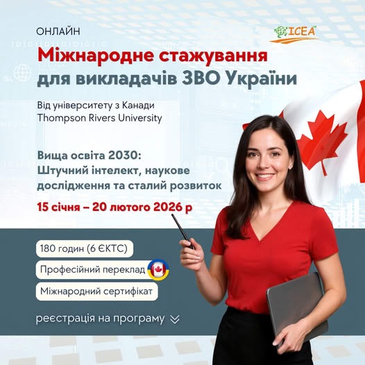15 січня – 20 лютого 2026 року викладачів українських закладів вищої освіти запрошують на онлайн міжнародне наукове стажування в Канаді від Thompson Rivers University «Вища освіта 2030: Штучний інтелект, наукове дослідження та сталий розвиток». Тривалість стажування: 180 годин (6 ЄКТС).