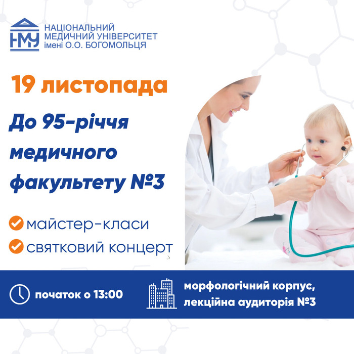 19 листопада у Національному медичному університеті імені О.О. Богомольця відбудеться ряд майстер-класів та святковий концерт з нагоди 95-річчя медичного факультету №3. До участі запрошуються студенти, викладачі, співробітники.