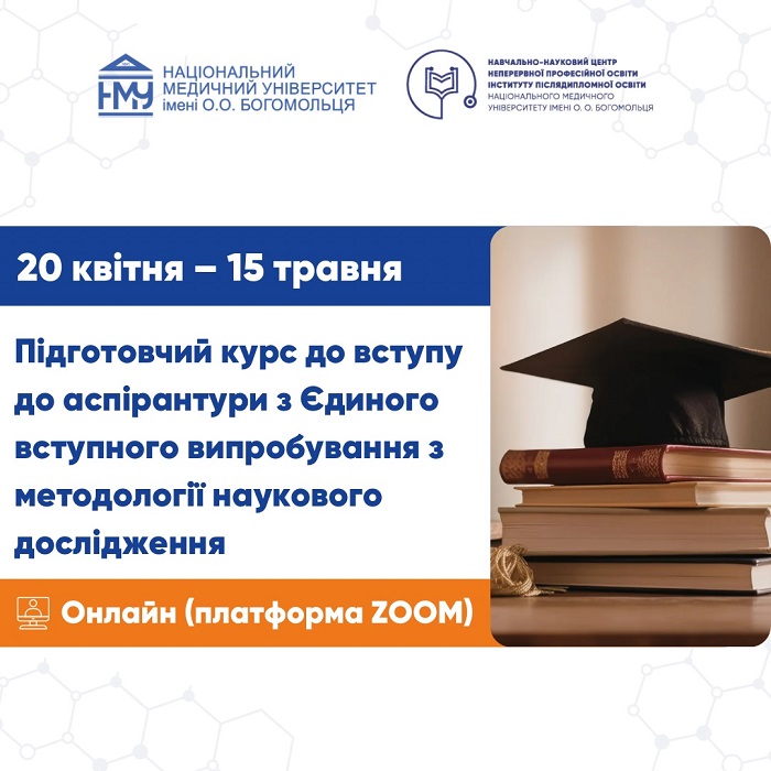 У Національному медичному університеті імені О.О. Богомольця розпочалася реєстрація на курс «Основи методології наукового дослідження» – підготовчий курс до єдиного вступного випробування (ЄВВ) для вступників до аспірантури у 2026 році. Контрактний курс триватиме з 20 квітня до 15 травня (150 годин).