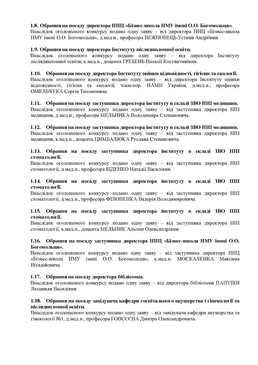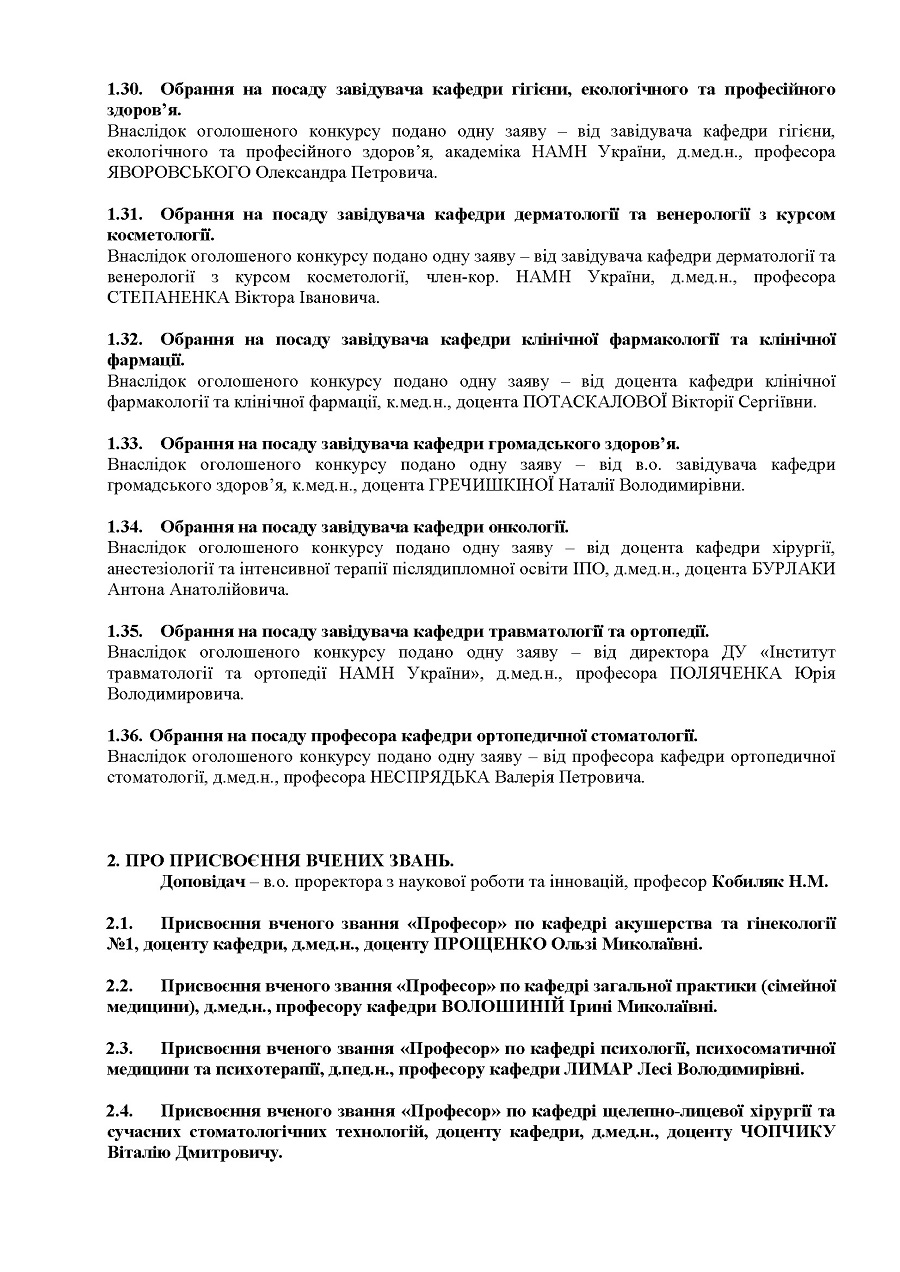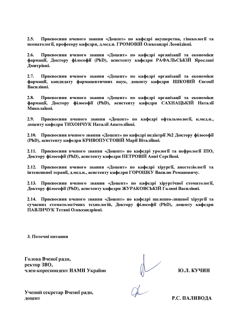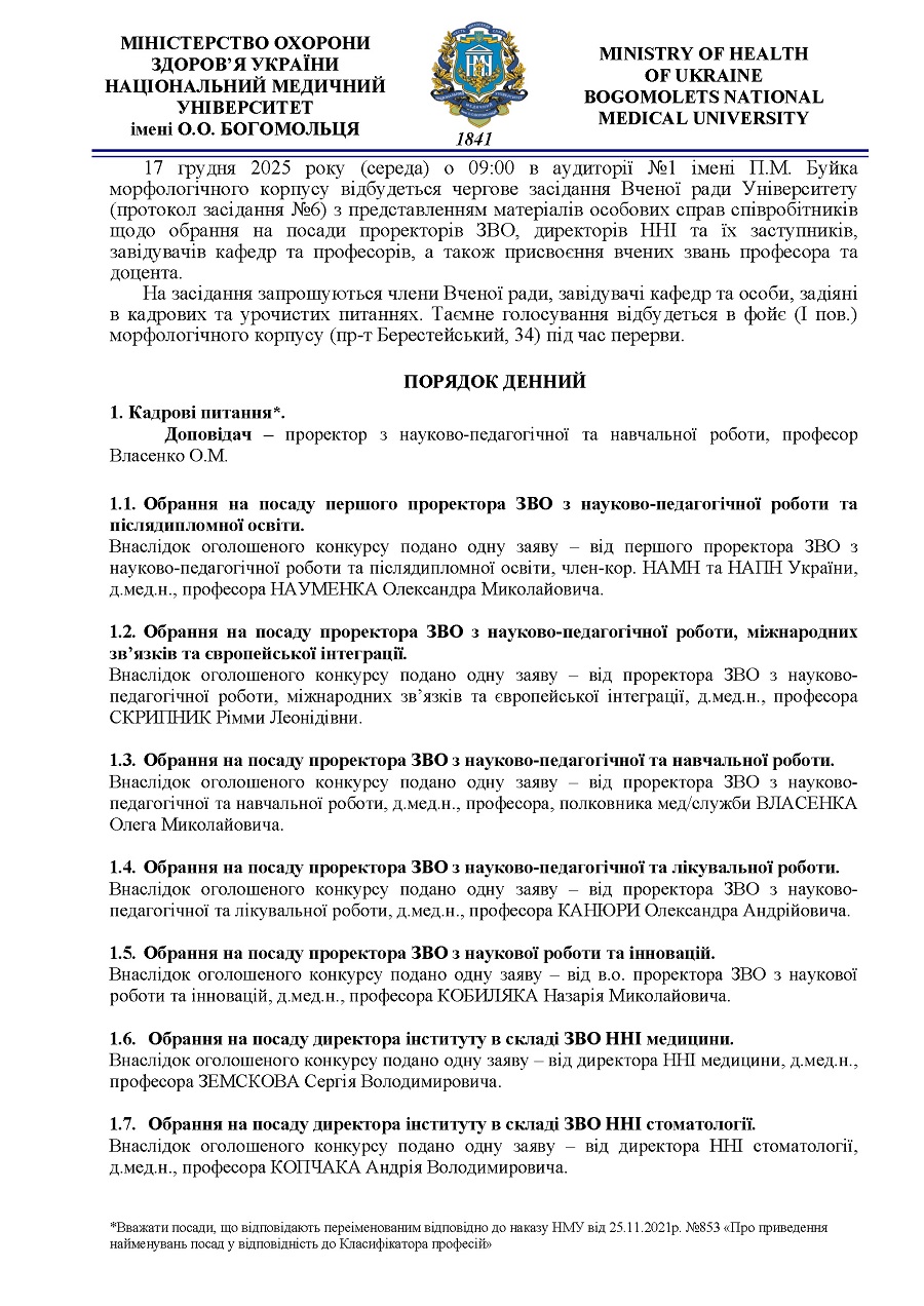 Порядок денний засідання Вченої ради НМУ імені О.О. Богомольця від 17 грудня 2025 року (протокол № 6)