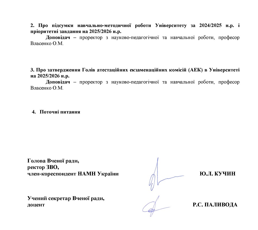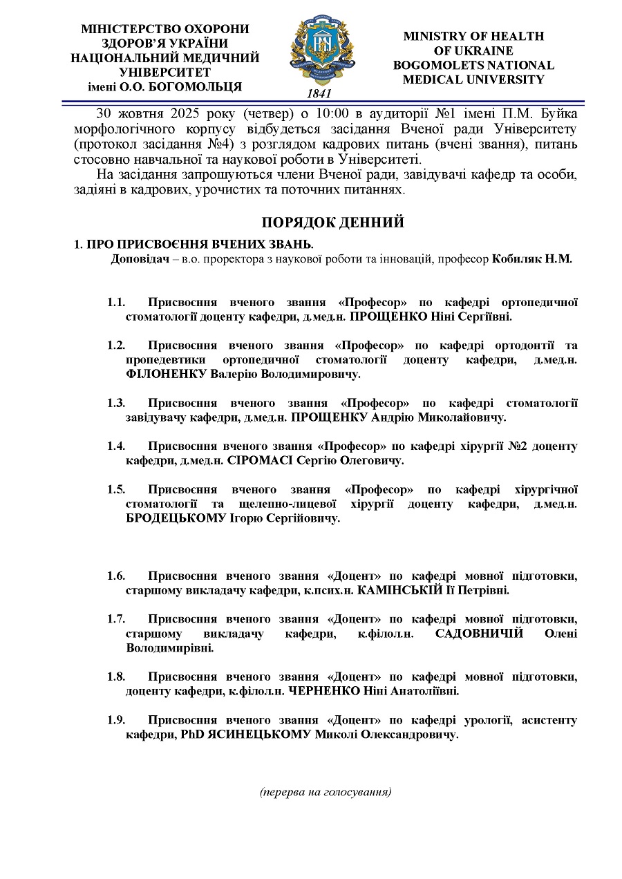 Порядок денний засідання Вченої ради НМУ імені О.О. Богомольця від 30 жовтня 2025 року (протокол № 4)