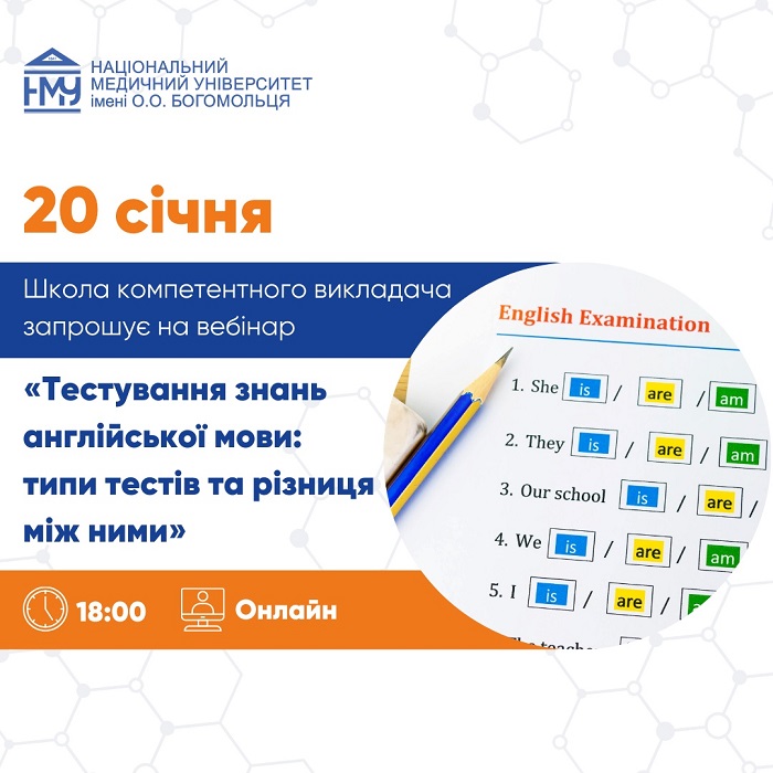 20 січня Школа компетентного викладача НМУ імені О.О. Богомольця запрошує на першу у новому році зустріч, присвячену актуальній темі, що цікавить і викладачів, і здобувачів освіти, – об’єктивне та коректне тестування знань англійської мови. Захід відбудеться о 18.00 в онлайн-форматі. До участі запрошуються викладачі іноземних мов, викладачі фахових дисциплін, які працюють з англомовними компонентами, адміністратори освітніх програм та усі, хто залучений до оцінювання мовних компетентностей.