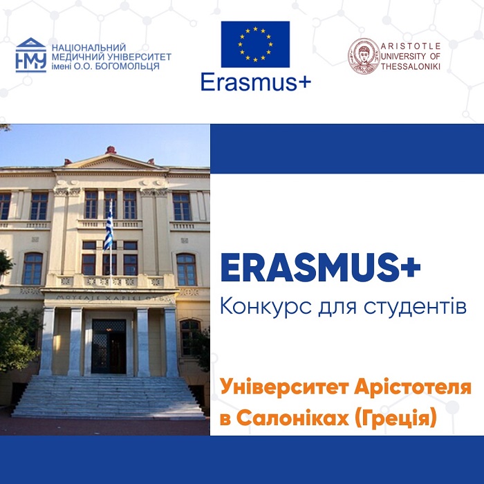 Відділ міжнародних зв’язків Національного медичного університету імені О.О. Богомольця оголошує конкурс заявок для студентів 2-5 курсів у межах міжнародного проєкту з кредитної мобільності Erasmus+КА171 від Університету Арістотеля в Салоніках (Греція). Заявки приймаються до 27 квітня 2026 року.