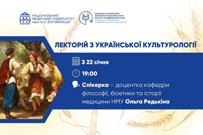 Навчально-науковий центр неперервної професійної освіти (ННЦ НПО ІПО) Національного медичного університету імені О.О. Богомольця запрошує до участі у лекторії з української культурології. Зустрічі стануть простором для інтелектуального діалогу, поглибленого аналізу та спільного осмислення української ідентичності крізь призму історії, мистецтва й традиції. Освітній цикл проводитиметься щочетверга в онлайн-форматі. Перша зустріч відбудеться 22 січня о 19.00.