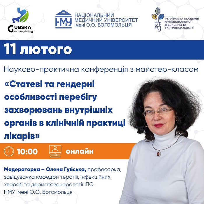 11 лютого в онлайн-форматі відбудеться науково-практична конференція з майстер-класом, присвячена сучасним підходам до оцінки та ведення пацієнтів із захворюваннями внутрішніх органів з урахуванням статевих і гендерних особливостей. Організатори – кафедра терапії, інфекційних хвороб та дерматовенерології післядипломної освіти Національного медичного університету імені О.О. Богомольця спільно з ГО «Українська Академія функціональної медицини та гастропсихології».