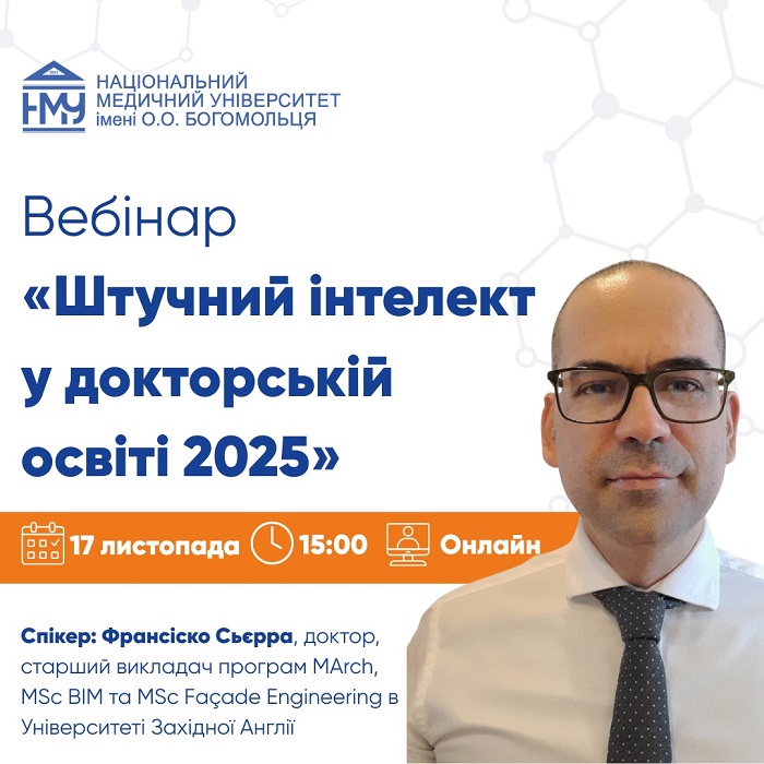 Співробітників і студентів Національного медичного університету імені О.О. Богомольця запрошують долучитися до вебінару «Штучний інтелект у докторській освіті 2025», що присвячений впливу штучного інтелекту на наукові дослідження та академічну доброчесність. Спікер – старший викладач програм MArch, MSc BIM та MSc Façade Engineering в Університеті Західної Англії, доктор Франсіско Сьєрра.