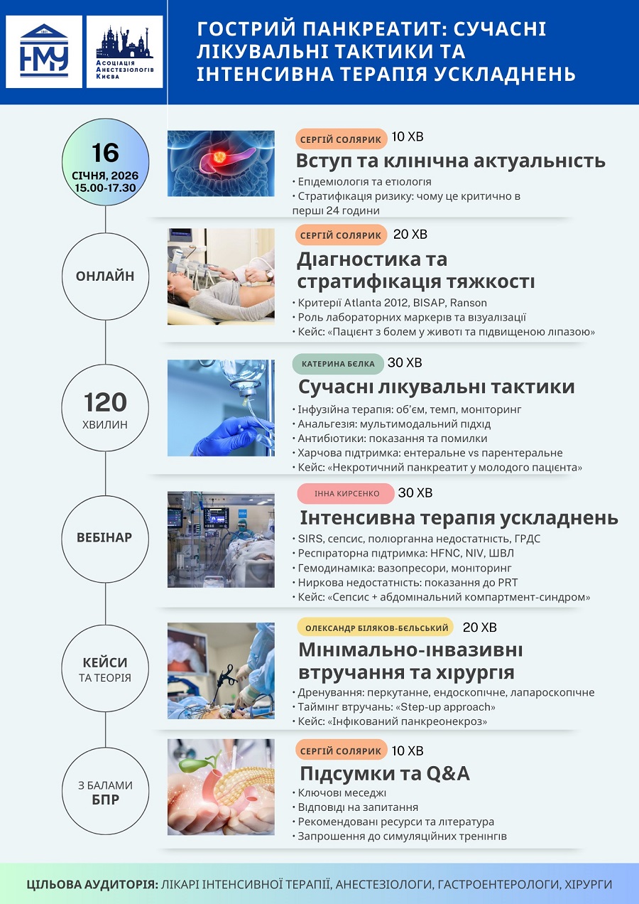 Захід буде корисним кожному, хто взаємодіє з пацієнтами з гострим панкреатитом: анестезіологам, лікарям інтенсивної терапії, гастроентерологам, хірургам. Учасники отримають не просто теорію, а чітке розуміння, що робити в реальних клінічних умовах.