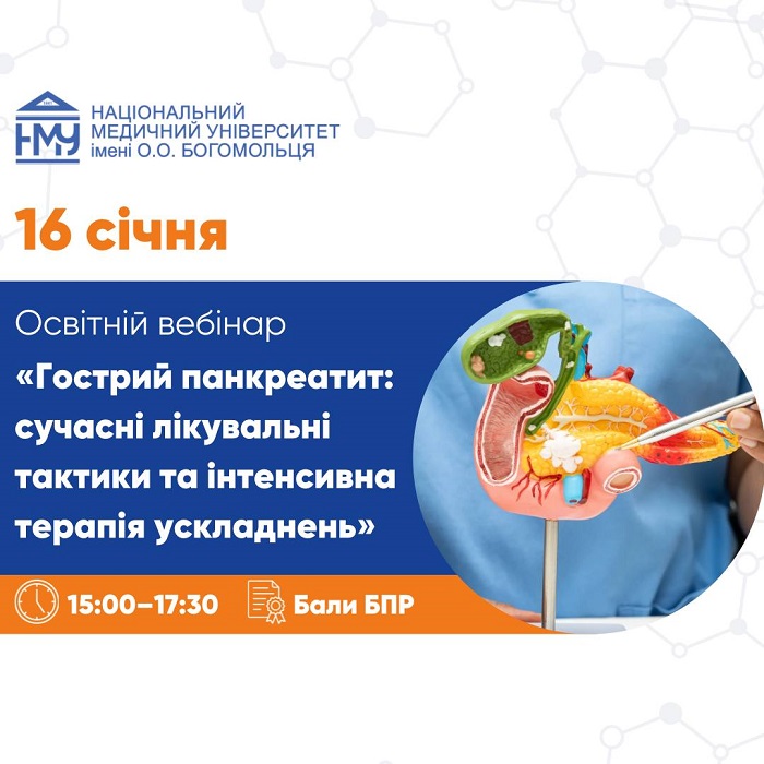 16 січня Національний медичний університет імені О.О. Богомольця спільно із Асоціацією анестезіологів Києва запрошують лікарів до участі в освітньому вебінарі «Гострий панкреатит: сучасні лікувальні тактики та інтенсивна терапія ускладнень». Захід передбачає нарахування балів БПР.