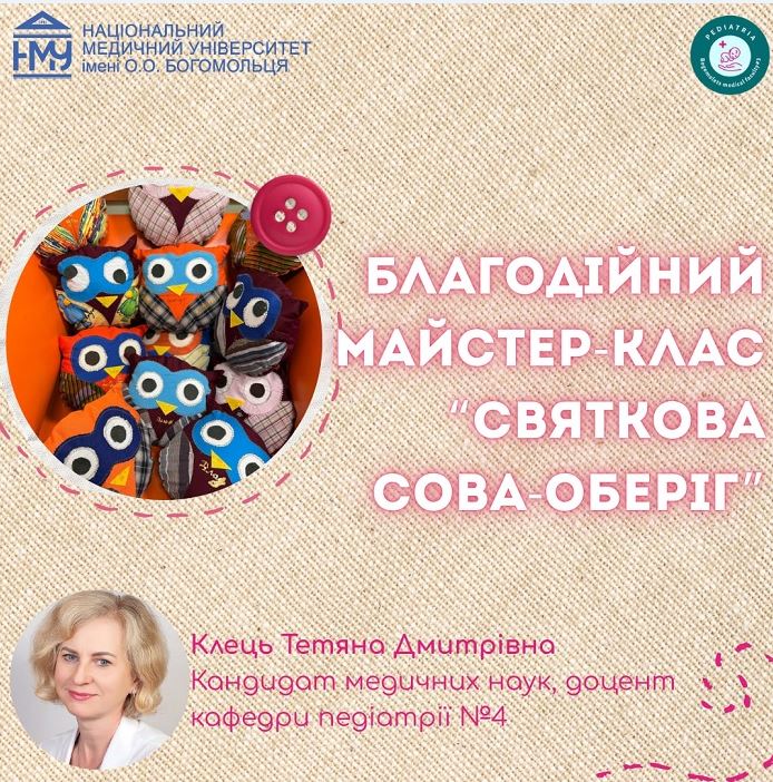 9 грудня у Національному медичному університеті імені О.О. Богомольця відбудеться особливий майстер-клас «Святкова Сова-оберіг». Захід, що поєднає творчий, терапевтичний та благодійний компоненти, для усіх охочих проведе кандидатка медичних наук, доцентка кафедри педіатрії №4 Тетяна Клець. Іграшки, створені учасниками, будуть передані на благодійний ярмарок.