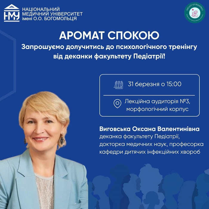 31 березня у Національному медичному університеті імені О.О. Богомольця у форматі офлайн відбудеться психологічна зустріч «Аромат спокою», що має на меті допомогти учасникам знайти внутрішню рівновагу, подолати втому та навчитися зберігати емоційну стійкість навіть у складні періоди життя. Спікерка заходу – деканка факультету педіатрії, докторка медичних наук, професорка Оксана Виговська.