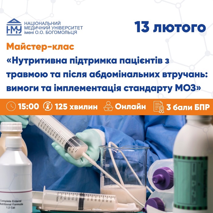 (УКР) Кафедра хірургії, анестезіології та ІТ запрошує на майстер-клас з нутрітивної підтримки