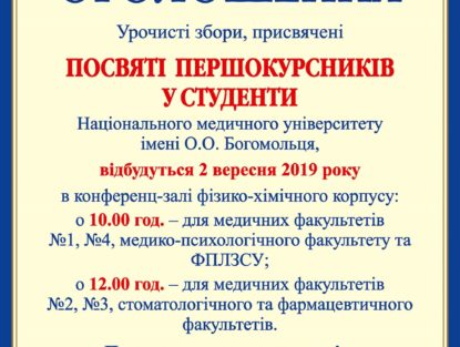 (УКР) 02 ВЕРЕСНЯ 2019 РОКУ ВІДБУДУТЬСЯ УРОЧИСТІ ЗБОРИ, ПРИСВЯЧЕНІ ПОСВЯТІ ПЕРШОКУРСНИКІВ У СТУДЕНТИ НМУ