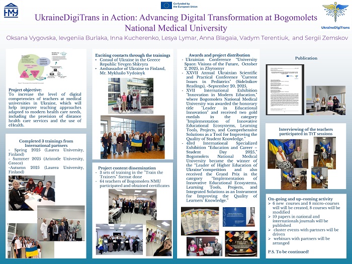 Throughout the autumn of 2025, Ukrainian and European higher education institutions actively continued the implementation of the Erasmus+ international project UkraineDigiTrans: Digital Transformation of Medical Education in Ukraine, aimed at modernizing medical education, advancing digital pedagogy, integrating artificial intelligence, and supporting the professional wellbeing of academic staff.
