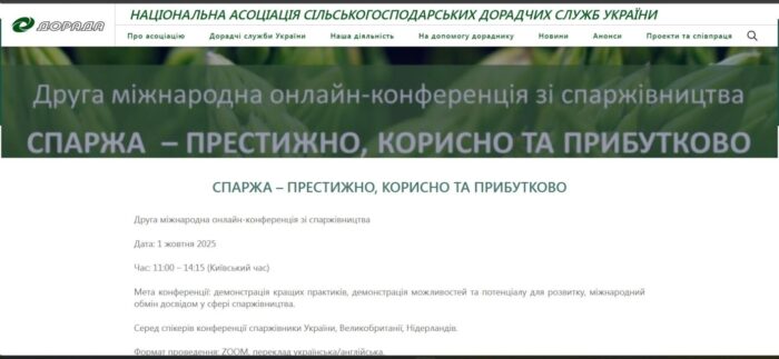 1 жовтня 2025 року відбулася Друга міжнародна онлайн-конференція, присвячена розвитку нової перспективної сільськогосподарської галузі – вирощуванню та використанню спаржі в Україні «Спаржа (Asparagus) – престижно, корисно та прибутково. Наступний крок розвитку спаржівництва в Україні».