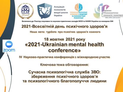 18 жовтня 2021 року за ініціативи кафедри загальної і медичної психології відбулася IV Науково-практична конференція з міжнародною участю «2021-Ukrainian mental health conference» (конференція входить до переліку, затвердженого МОЗ та НАМН України). Партнерами та співорганізаторами конференції виступили: Асоціація з медичної та психологічної реабілітації, Асоціація психологів вищої школи, Девізіон «Психоаналітична психологія і психотерапія» НПА, дійсного члена EFPA. … Читати далі 2021-UKRAINIAN MENTAL HEALTH CONFERENCE – ПОСТУПОВА РЕАЛІЗАЦІЯ ПРИНЦИПІВ ПСИХОЛОГІЧНОЇ МЕДИЦИНИ ТА МЕДИЧНОЇ ПСИХОЛОГІЇ З НАГОДИ СВЯТКУВАННЯ ВСЕСВІТНЬОГО ДНЯ ПСИХІЧНОГО ЗДОРОВ’Я