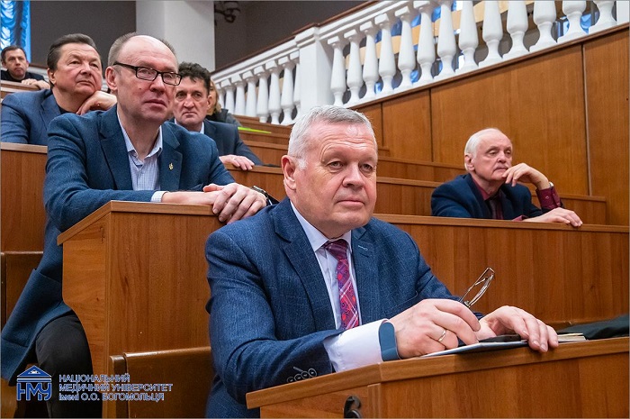 За головування ректора Юрія Кучина участь у засіданні взяли перший проректор з науково-педагогічної роботи та післядипломної освіти Олександр Науменко, проректор з науково-педагогічної та лікувальної роботи Олександр Канюра, проректор з науково-педагогічної та навчальної роботи Олег Власенко, проректорка з науково-педагогічної роботи, міжнародних зв’язків та європейської інтеграції Рімма Скрипник, виконувач обов’язків проректора з наукової роботи та інновацій Назарій Кобиляк, заступники ректора Ігор Драпей і Юрій Богдан, директори інститутів, декани факультетів, завідувачі кафедр, керівники структурних підрозділів, студенти.