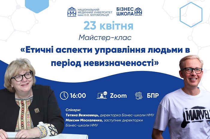 23 квітня в Бізнес-школі Національного медичного університету імені О.О. Богомольця онлайн відбудеться майстер-клас «Етичні аспекти управління людьми в період невизначеності». У межах заходу сторони розглянуть ключове питання, що є обов’язковим напрямком безперервного професійного розвитку (БПР), – як залишатися ефективним керівником і не втратити людей.