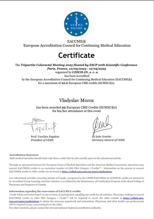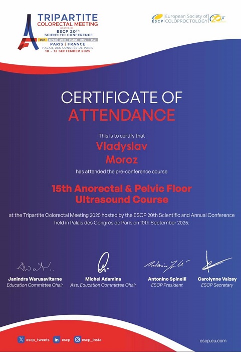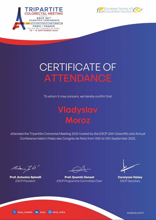У Парижі (Франція) відбулася Тристороння конференція з колоректальної хірургії 2025, проведена в межах 20-ї наукової конференції Європейського товариства колопроктологів (Tripartite Colorectal Meeting 2025 hosted by the ESCP 20th Scientific and Annual Conference). В авторитетному науково-практичному заході, що об’єднав провідних експертів, клініцистів, дослідників та фахівців галузі колопроктології, взяв участь доцент кафедри хірургії №1 Національного медичного університету імені О.О. Богомольця Владислав Мороз.