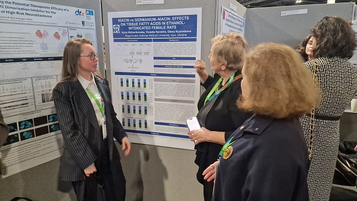 За результатами проведеної на кафедрі хімії ліків та лікарської токсикології НМУ науково-дослідної роботи, доцентка Віолетта Нароха представила на заході спільну постерну доповідь «Порівняння впливу ніацину та германій-ніацинового комплексу на вміст жирних кислот у мозку, серці, печінці та нирках у самок щурів з гострою етаноловою інтоксикацією», виконану в співавторстві з завідувачкою кафедри, професоркою Іриною Ніженковською та доценткою Оленою Кузнецовою.