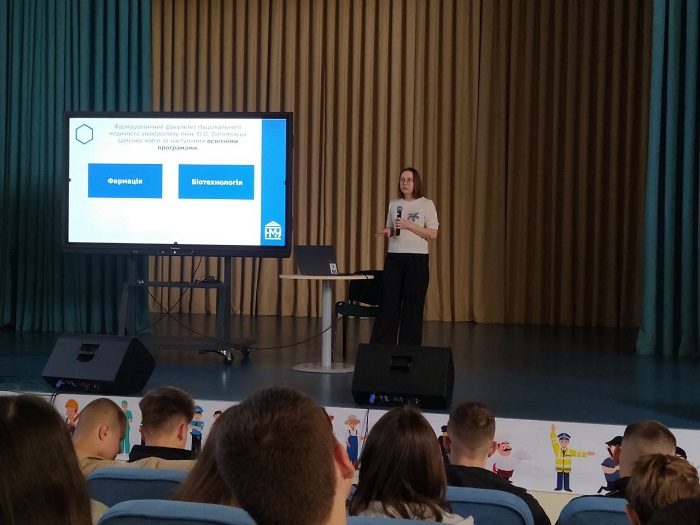 Доцентка кафедри Олена Глущенко розповіла випускникам ліцеїв про освітні програми, за якими можна отримати освіту на фармацевтичному факультеті НМУ зі спеціальностей «Фармація, промислова фармація» і «Біотехнології та біоінженерія», про перспективи працевлаштування випускників. Асистентка кафедри Тетяна Буткевич ознайомила майбутніх абітурієнтів з особливостями вступної кампанії 2025 року.