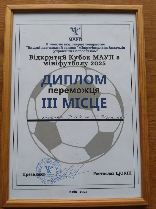 15 грудня другий склад збірної команди НМУ взяв участь у Відкритому Кубку МАУП з мініфутболу 2025. Серед команд-суперниць – команди Міжрегіональної академії управління персоналом, Європейського університету, Київського національного університету технологій та дизайну та інші. У складі команди НМУ виступили студенти Навчально-наукового інституту медицини нашого Університету Іван Куява, Мурат Бабаєв, Назар Ігнатенко, Станіслав Богданенко, Олександр Телявський, Олексій Матина та студент ФПЛЗСУ Костянтин Чудо. У підсумку змагань наші футболісти посіли 3 місце, отримали кубок, диплом і медалі.