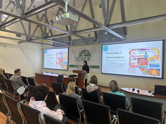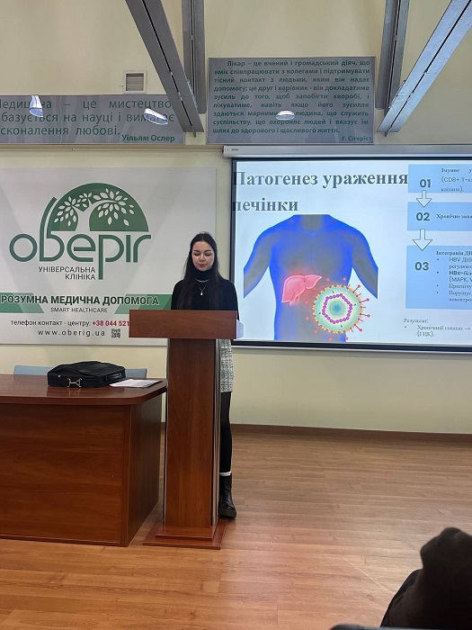 Змістовну доповідь про роль паразитів Opisthorchis viverrini та Clonorchis sinensis, яких ВООЗ відносить до біологічних канцерогенів I класу, презентувала студентка 5 курсу Навчально-наукового інституту медицини Олександра Кочанова. У межах виступу доповідачка також розповіла про онкогенність, патогенез та перебіг вірусних гепатитів B і C, підкресливши їх значення щодо розвитку гепатоцелюлярної карциноми.