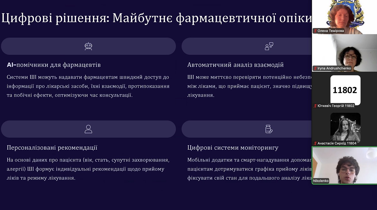 Засідання відбулося в продуктивній конструктивній атмосфері зацікавленості як з боку студентів, так і зі сторони викладачів. Особливу увагу учасники виявили під час колективного обговорення можливих перспектив щодо розробок «штучно інтелектуальних» помічників та довідників для фармацевтів, які б були корисними в практичній щоденній роботі.