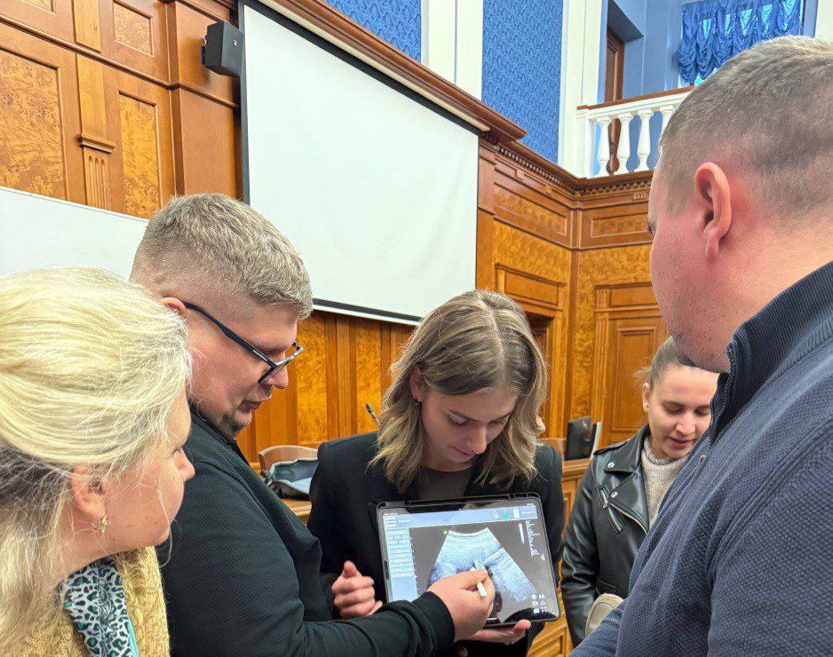 Учасники засідання також взяли участь у майстер-класі «Роль УЗД в диференційній діагностиці гострого апендициту та позаматкової вагітності», який провели представники наукових кафедр НМУ імені О.О. Богомольця – доцент кафедри хірургії №2 Максим Приступюк, доцент кафедри хірургії №1 Владислав Мороз та асистентка кафедри акушерства і гінекології №2 Наталія Скурятіна. Як зазначалося під час практичного заняття, на сьогодні УЗД є одним з найбільш інформативних методів діагностики багатьох захворювань. Зокрема, чутливість ультразвукової діагностики при гострому апендициті наближається до 100%, а точність виявлення маткової та придаткової патології – 95%. Гуртківці відпрацювали практичні навички з ультразвукової діагностики органів черевної порожнини та органів малого тазу.