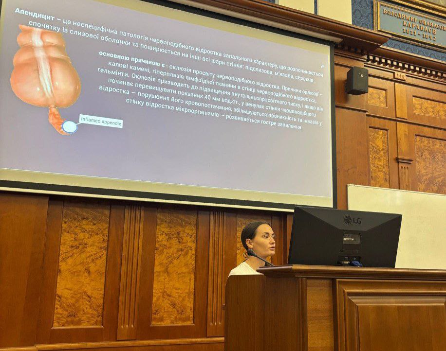 Зокрема, студентка 4 курсу медичного факультету №3 НМУ імені О.О. Богомольця Маргарита Василенко, яка виступала від кафедри хірургії №2, розповіла про основні аспекти етіопатогенезу, клінічний перебіг та види лікування гострого апендициту в жінок репродуктивного віку.