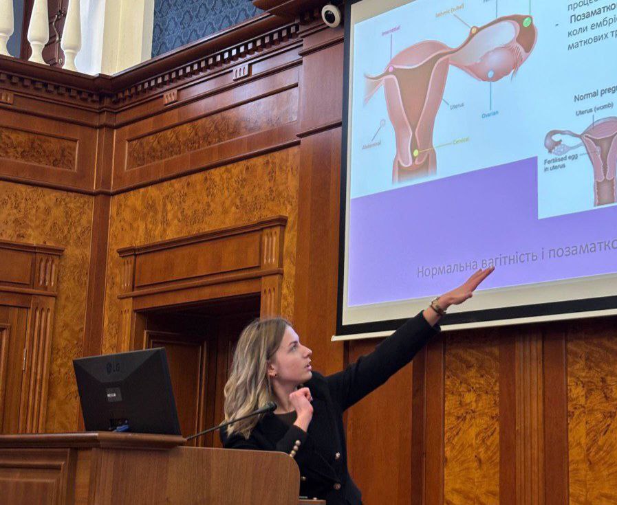 Студентський науковий гурток кафедри акушерства і гінекології №2 представила четвертокурсниця Навчально-наукового інституту медицини НМУ імені О.О. Богомольця Світлана Алєксєєва. Доповідачка детально розкрила тему позаматкової вагітності та приділила особливу увагу факторам ризику, що можуть стати причиною розвитку патології, а також формам, особливостям перебігу, методам діагностики й лікування небезпечного для життя жінки стану.