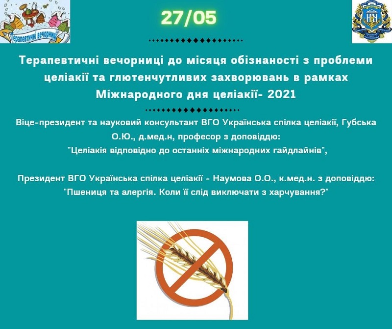 - 27 травня – для фахівців медичної галузі – зустріч в Клубі “Терапевтичні вечорниці” в форматі зум-конференції. Тема – “Целіакія в останніх міжнародних рекомендаціях“