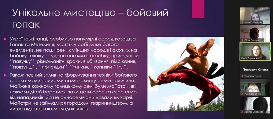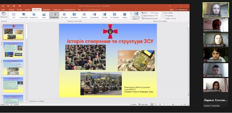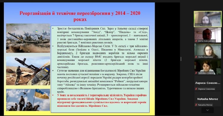 Коли йдеться про захист України, неможливо не згадати історичні аспекти формування військ. Весь період існування, починаючи із часів Київської Русі, наша країна була змушена захищати свою державність. Одним із найсильніших військових формувань в історії країни було Запорізьке козацтво, про яке в своїй презентації згадала студентка 4-го курсу Любов Борисюк.