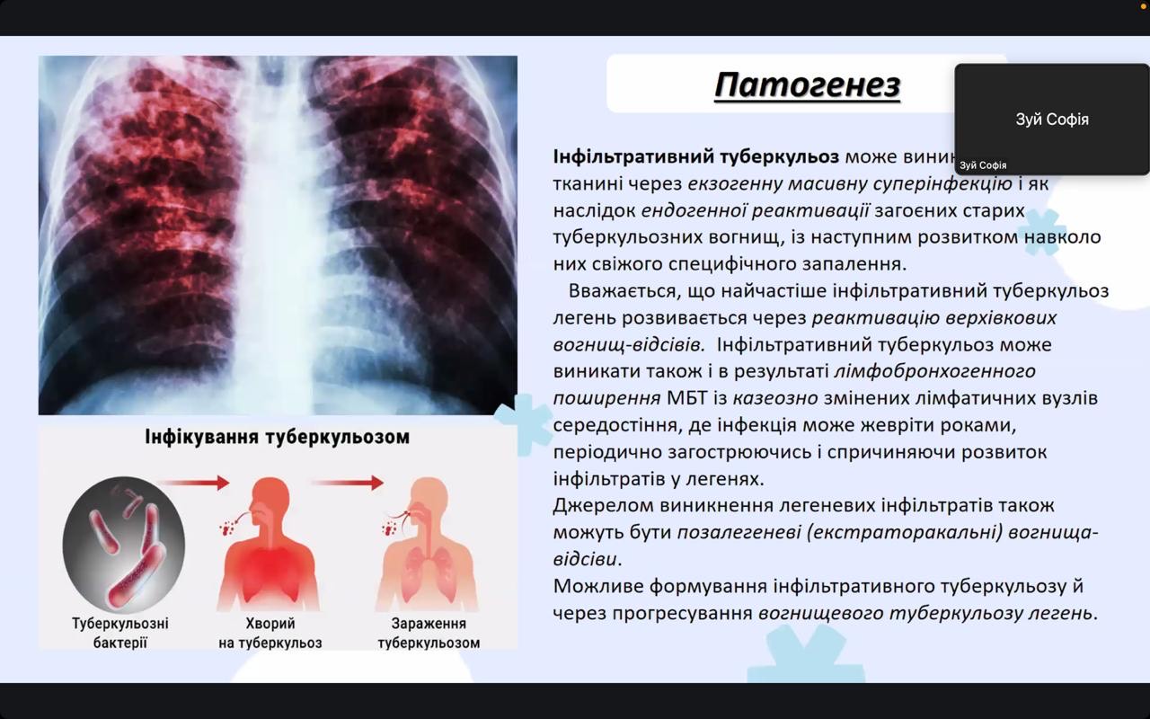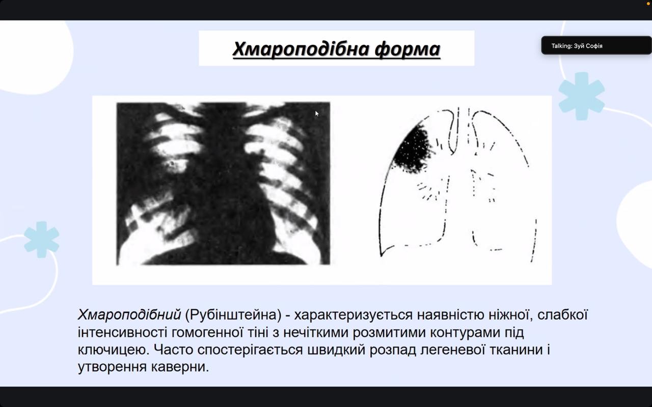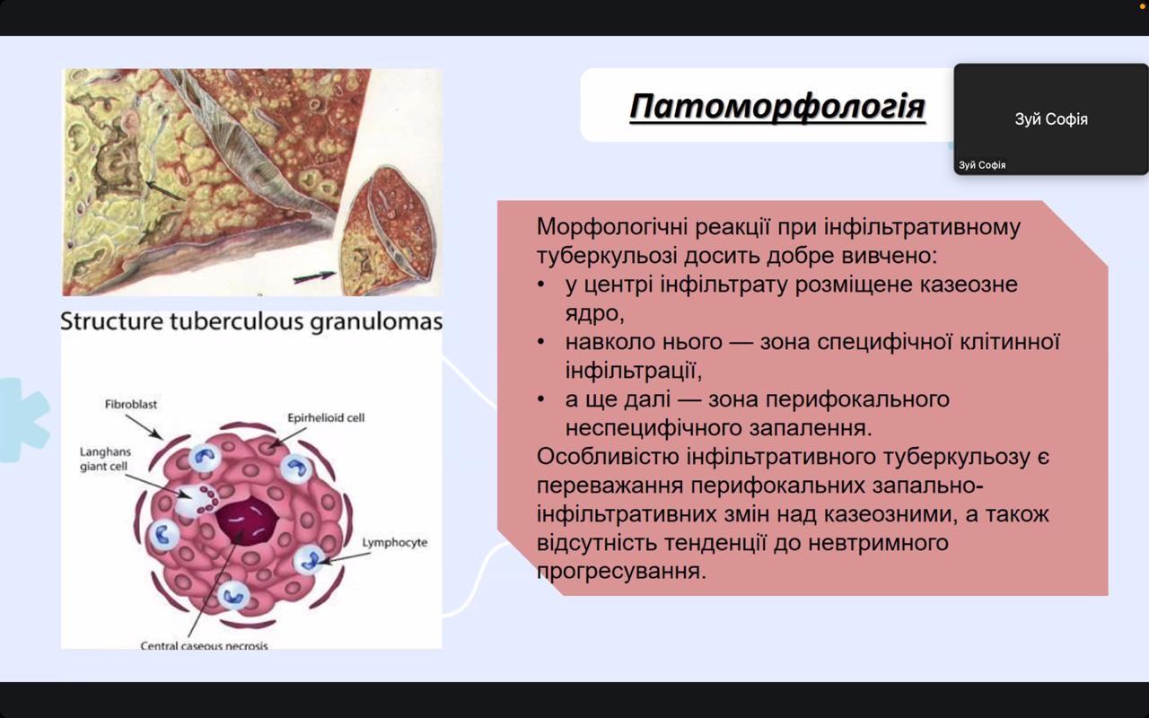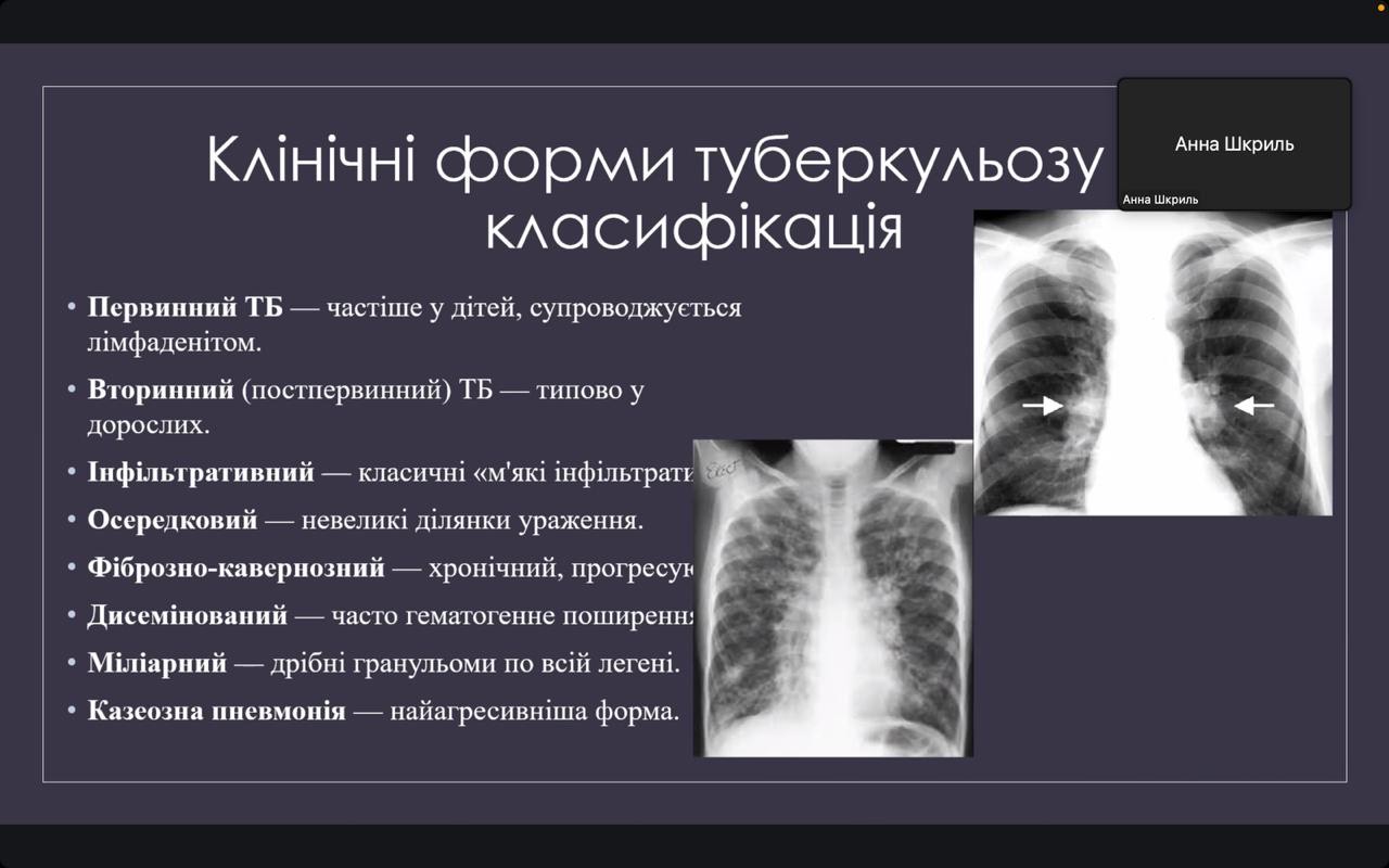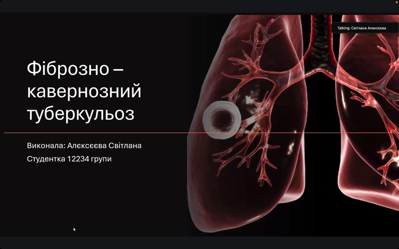 Окреслила ситуацію щодо туберкульозу в Україні та світі студентка 4 курсу Анна Шкриль. Доповідачка детально зупинилася на особливостях перебігу казеозної пневмонії та відмітила, що невдалий курс лікування пацієнтів може стати причиною розвитку хронічних форм туберкульозу (зокрема, фіброзно-кавернозної). Вона також поінформувала про алгоритми проведення диференційної діагностика казеозної пневмонії та інших захворювань органів дихання.  Про інфільтративну форму туберкульозу, клінічний перебіг, діагностику та лікування розповіла студентка Софія Зуй. Доповідачка також навела приклади тестових і ситуаційних клінічних задач щодо ведення таких пацієнтів.  Особливу зацікавленість викликала серед учасників доповідь студентки 4 курсу Світлани Алєксєєвої. Вона поінформувала гуртківців про фактори, які сприяють розвитку фіброзно-кавернозної форми туберкульозу та виділила групи ризику щодо розвитку цієї клінічної форми.  Доповідачка також звернула увагу на рентгенологічні ознаки фіброзно-кавернозної форми та зупинилася на методах лікування, які застосовуються у практичній фтизіатрії, як консервативних, так і хірургічних. Окрім того, студентка зробила акцент на постійне оновлення настанов стосовно ведення пацієнтів з туберкульозом, що допомагає лікарям на практиці використовувати найбільш сучасні й ефективні схеми та методи лікування.