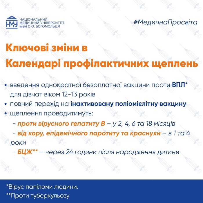 Оновлення в Національному календарі профілактичних щеплень приводить практику вакцинації в Україні у відповідність до міжнародних стандартів. Зокрема, змінено особливості щеплень та поєднання препаратів, спираючись на досвід країн Європи.
