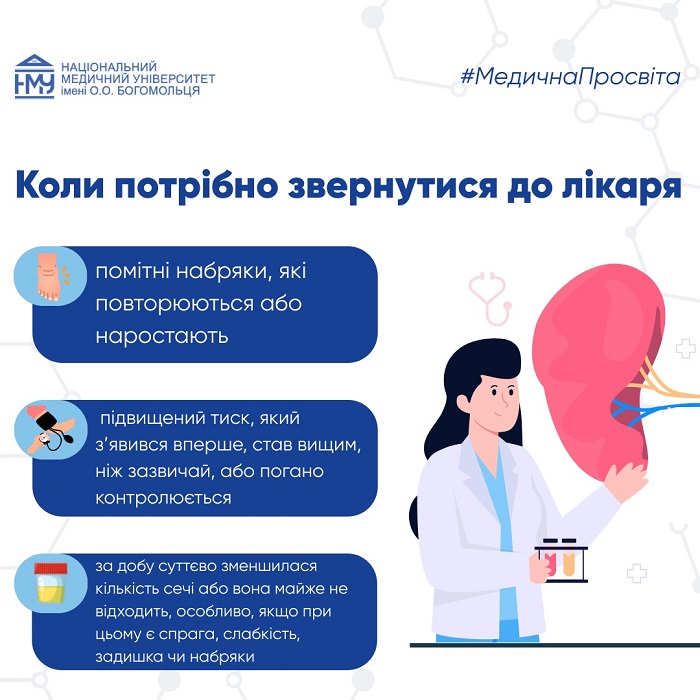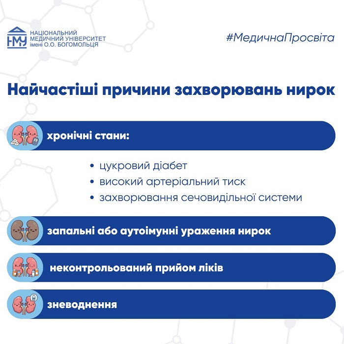 10% населення світу живуть із хронічними хворобами нирок, які часто називають «мовчазними вбивцями» через їхню дуже підступну особливість: нирки можуть довго втрачати свою функцію майже без помітних симптомів. Людина живе звичним життям, нічого «особливого» не відчуває, а захворювання вже розпочалося. У межах інформаційно-роз’яснювального проєкту #МедичнаПросвіта фахівці кафедри нефрології та урології Національного медичного університету імені О.О. Богомольця розповідають про причини захворювань, перші ознаки проблем з нирками, коли необхідно звернутися до лікаря, щоб вчасно виявити хворобу та не допустити серйозних ускладнень.