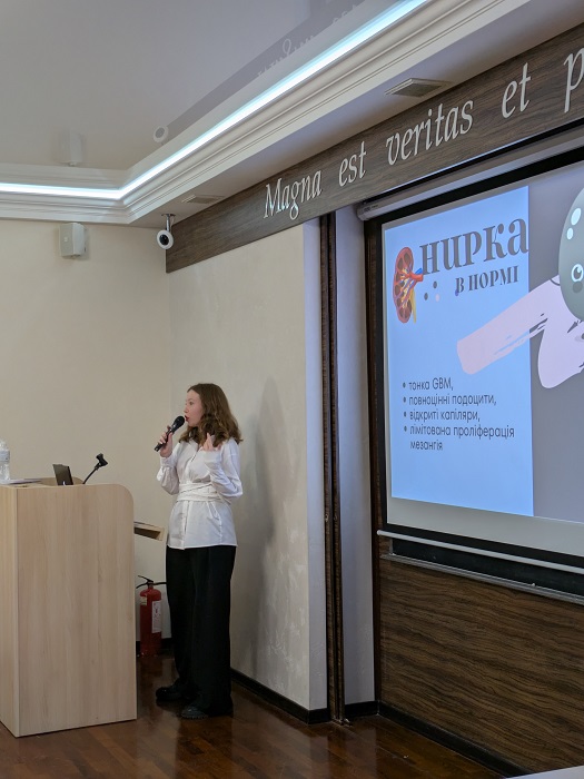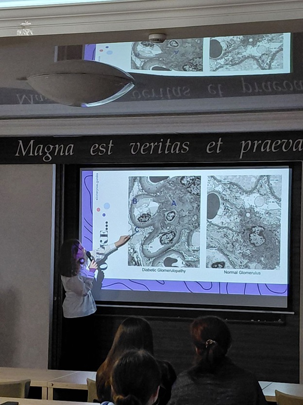 Про морфологічні зміни при діабетичному ураженні нирок поінформували присутніх представниці кафедри нефрології та урології Інституту післядипломної освіти, лікарка-нефрологиня, доцентка  Олена Карпенко та лікарка-інтернка, патологоанатоминя Катерина Гурська. Доповідачки розповіли про морфологічні особливості діабетичної нефропатії, включно зі змінами клубочків, базальних мембран, судин та інтерстиції. Вони також показали зв’язок між морфологічними змінами та клінічним перебігом захворювання.