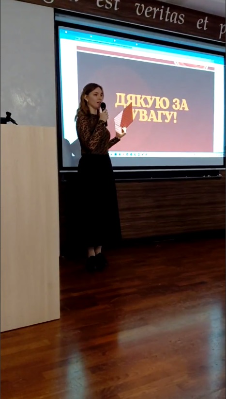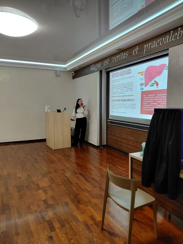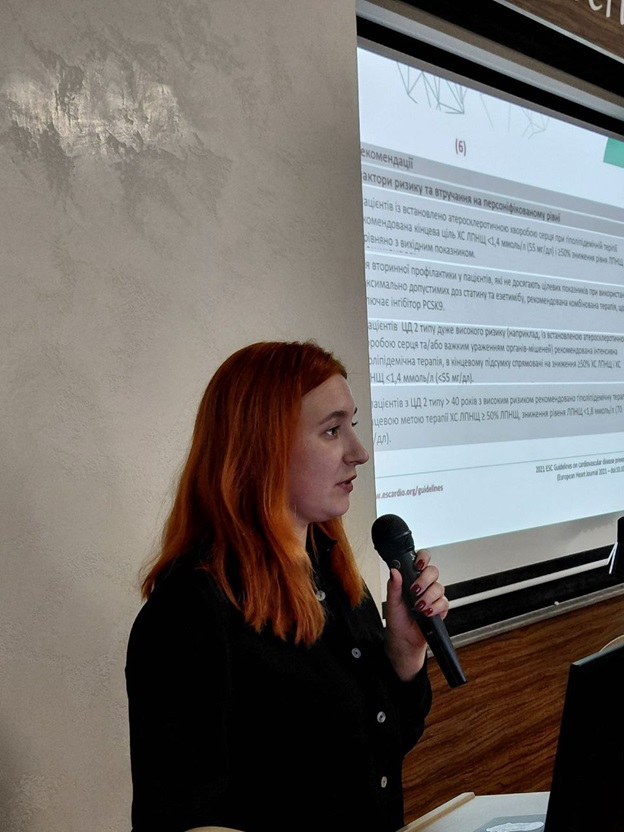 Представила доповідь «Діабетична дисліпідемія» учасниця студентського наукового гуртка кафедри внутрішньої медицини №1 Дарʼя Михайлова. Вона детально розповіла про типові порушення ліпідного профілю при ЦД та охарактеризувала його роль у формуванні високого серцево-судинного ризику. Спікерка також поінформувала про сучасні підходи до медикаментозної корекції та наголосила на важливості зміни способу життя при дислепідемії.