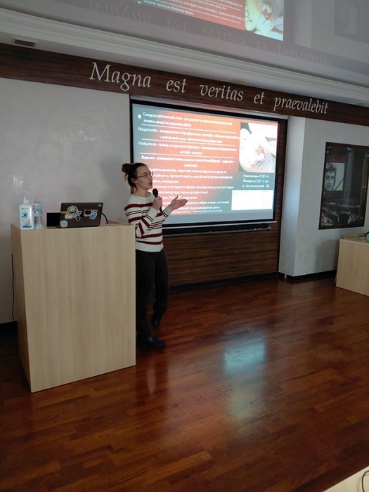 Доповідь на тему «Цукровий діабет. Епідеміологія. Ураження органів та систем» презентувала керівниця студентського наукового гуртка кафедри ендокринології, лікарка-ендокринологиня Вікторія Єрохович. Вона надала актуальні дані про поширеність цукрового діабету, основні фактори ризику, а також звернула увагу на спектр хронічних ускладнень з боку серцево-судинної, нервової, ниркової та інших систем, які провокує ЦД.