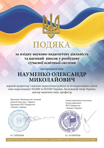 Також за плідну науково-педагогічну діяльність та вагомий внесок у розбудову сучасної освітньої системи отримали подяки ректор НМУ імені О.О. Богомольця, професор Юрій Кучин і перший проректор з науково-педагогічної роботи та післядипломної освіти, професор Олександр Науменко.