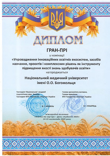 Варто зазначити, що наш Університет неодноразово визнано лідером вищої освіти України. Зокрема, за підсумками 42-ї міжнародної спеціалізованої онлайн-виставки «Освіта та кар’єра-2025» НМУ імені О.О. Богомольця став переможцем конкурсу «Лідер вищої освіти України», а також володарем гран-прі в номінації «Інноваційні технології штучного інтелекту в освіті: відновлення знань і навичок».