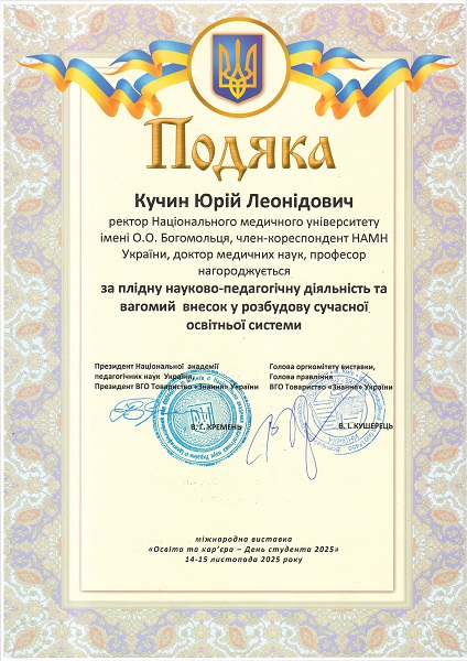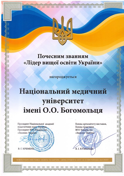 Варто зазначити, що наш Університет неодноразово визнано лідером вищої освіти України. Зокрема, за підсумками 42-ї міжнародної спеціалізованої онлайн-виставки «Освіта та кар’єра-2025» НМУ імені О.О. Богомольця став переможцем конкурсу «Лідер вищої освіти України», а також володарем гран-прі в номінації «Інноваційні технології штучного інтелекту в освіті: відновлення знань і навичок».