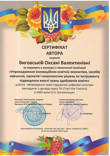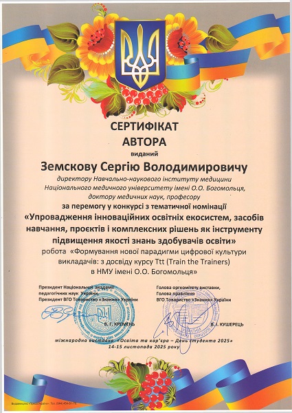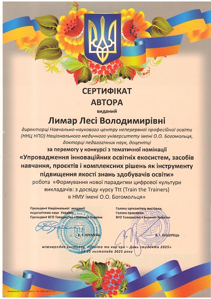 Окрім того, за перемогу у конкурсі з тематичних номінацій «Упровадження інноваційних освітніх екосистем, засобів навчання, проєктів і комплексних рішень як інструменту підвищення якості знань здобувачів освіти», на якому було представлено роботу «Формування нової парадигми цифрової культури викладачів: з досвіду курсу Тtt (Train the Trainers) в НМУ імені О.О. Богомольця» сертифікати автора отримали директор Навчально-наукового інституту медицини, професор Сергій Земсков, директорка Навчально-наукового центру неперервної професійної освіти ІПО, доцентка Леся Лимар, деканка медичного факультету №3, професорка Оксана Виговська, начальниця відділу навчально-методичної роботи, ліцензування та акредитації, доцентка Інна Кучеренко, заступниця керівника Центру комунікацій, організаційної і редакційної роботи Олена Горова, професорка кафедри педіатрії №4 Євгенія Бурлака.
