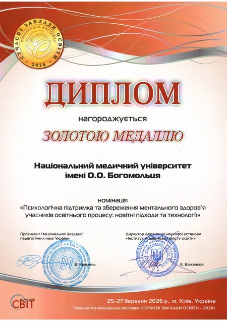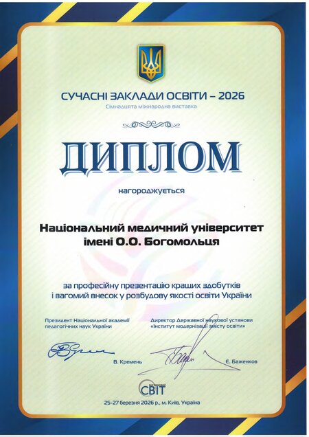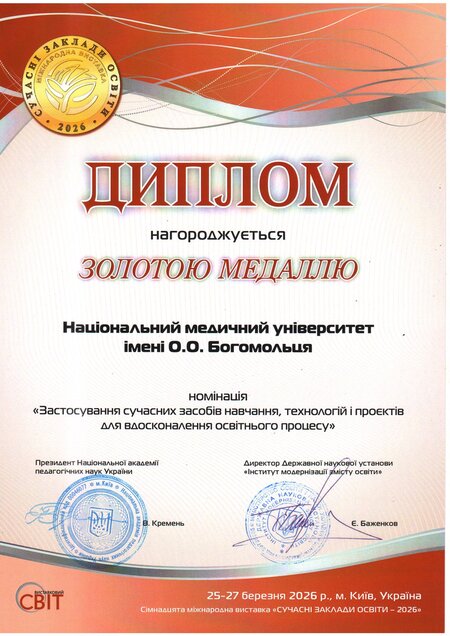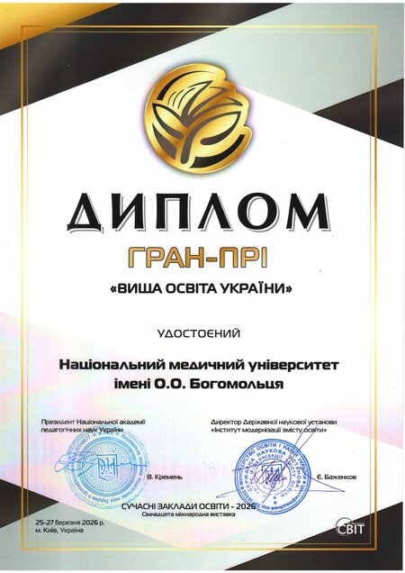 Національний медичний університет імені О.О. Богомольця отримав Гран-прі «Лідер вищої освіти України» та дві золоті медалі в тематичних номінаціях ХVІІ Міжнародної виставки «Сучасні заклади освіти – 2026». Такі досягнення отримано за результатами рейтингового виставкового конкурсу та конкурсу 12-ти тематичних номінацій, на які було подано понад п’ятсот робіт.