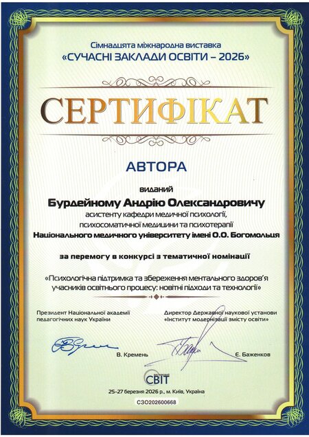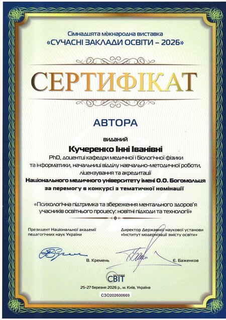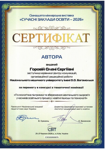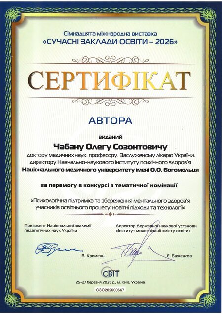У номінації «Психологічна підтримка та збереження ментального здоров’я учасників освітнього процесу: новітні підходи та технології» наш Університет отримав золоту медаль, а автори представленої роботи, зокрема директор Навчально-наукового інституту психологічного здоров’я, професор Олег Чабан, асистент кафедри медичної психології, психосоматичної медицини та психотерапії Андрій Бурдейний, начальниця відділу навчально-методичної роботи, ліцензування та акредитації, доцентка Інна Кучеренко, заступниця керівника Центру комунікацій, організаційної і редакційної роботи Олена Горова – іменні сертифікати.