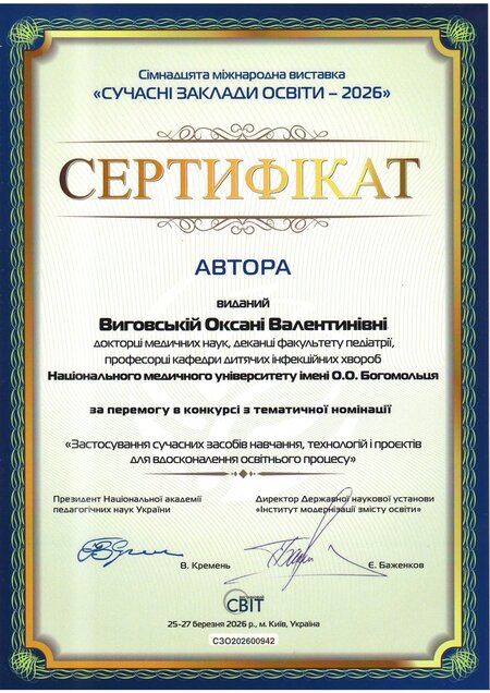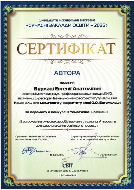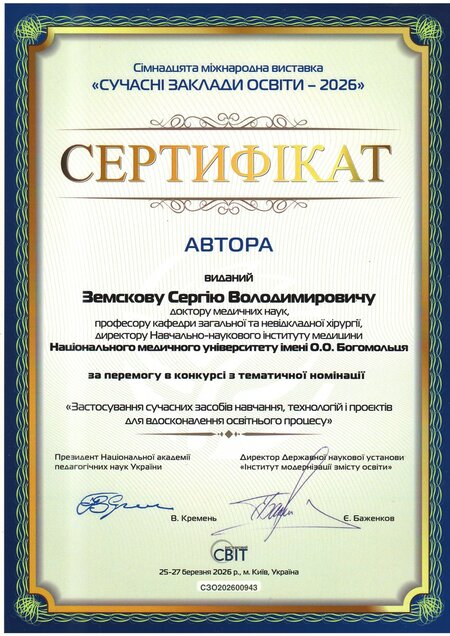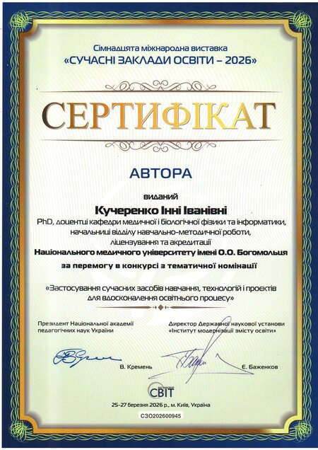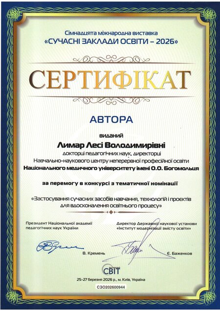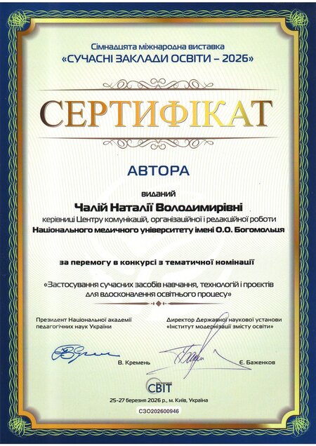 У номінації «Застосування сучасних засобів навчання, технологій і проєктів для вдосконалення освітнього процесу» – золота медаль та авторські сертифікати отримали: директор Навчально-наукового інституту медицини, професор Сергій Земсков, директорка Навчально-наукового центру неперервної професійної освіти, професорка Леся Лимар, деканка медичного факультету №3, професорка Оксана Виговська, начальниця відділу навчально-методичної роботи, ліцензування та акредитації, доцентка Інна Кучеренко, професорка кафедри педіатрії №2 Євгенія Бурлака та керівниця Центру комунікацій, організаційної і редакційної роботи НМУ Наталія Чала.