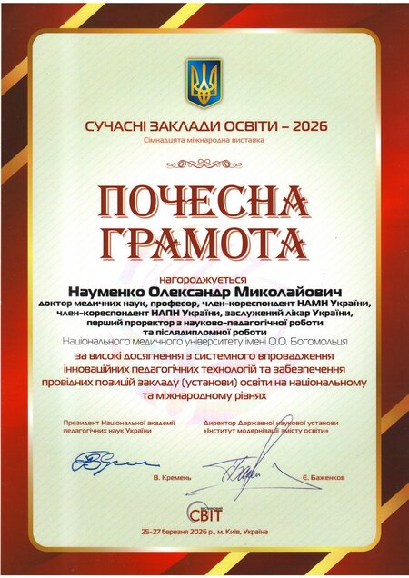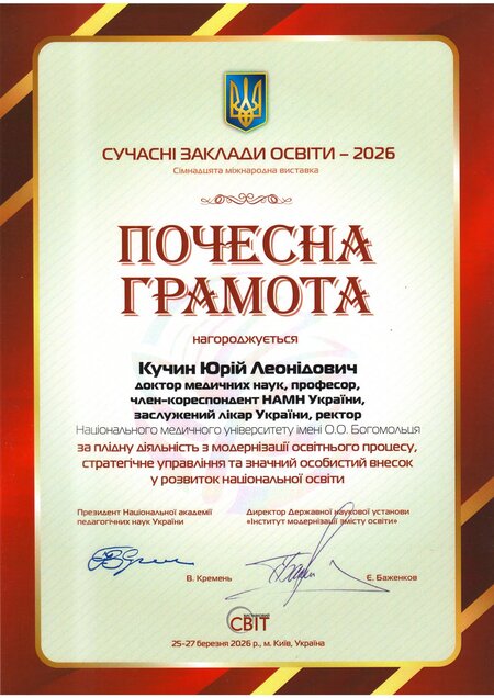 Почесною грамотою «За плідну діяльність з модернізації освітнього процесу, стратегічне управління та значний особистий внесок у розвиток національної освіти» нагороджено ректора НМУ імені О.О. Богомольця, професора Юрія Кучина.