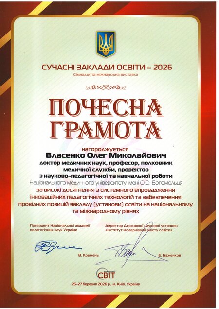 Першого проректора з науково-педагогічної роботи та післядипломної освіти, професора Олександра Науменка та проректора з науково-педагогічної та навчальної роботи, професора Олега Власенка нагороджено Почесними грамотами «За високі досягнення з системного впровадження інноваційних педагогічних технологій та забезпечення провідних позицій закладу (установи) освіти на національному та міжнародному рівнях».