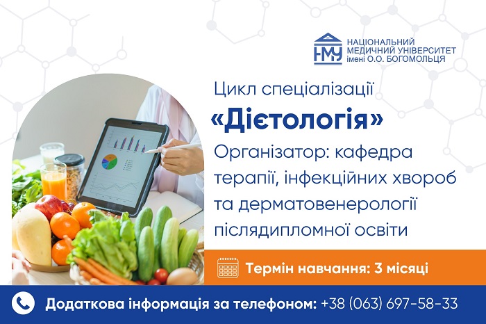 Кафедра терапії, інфекційних хвороб та дерматовенерології післядипломної освіти Національного медичного університету імені О.О. Богомольця запрошує на цикл спеціалізації з «Дієтології». Програма навчання спрямована на поглиблення знань у сфері клінічного харчування, профілактичної медицини та індивідуалізації дієтичних рекомендацій відповідно до сучасних європейських стандартів.
