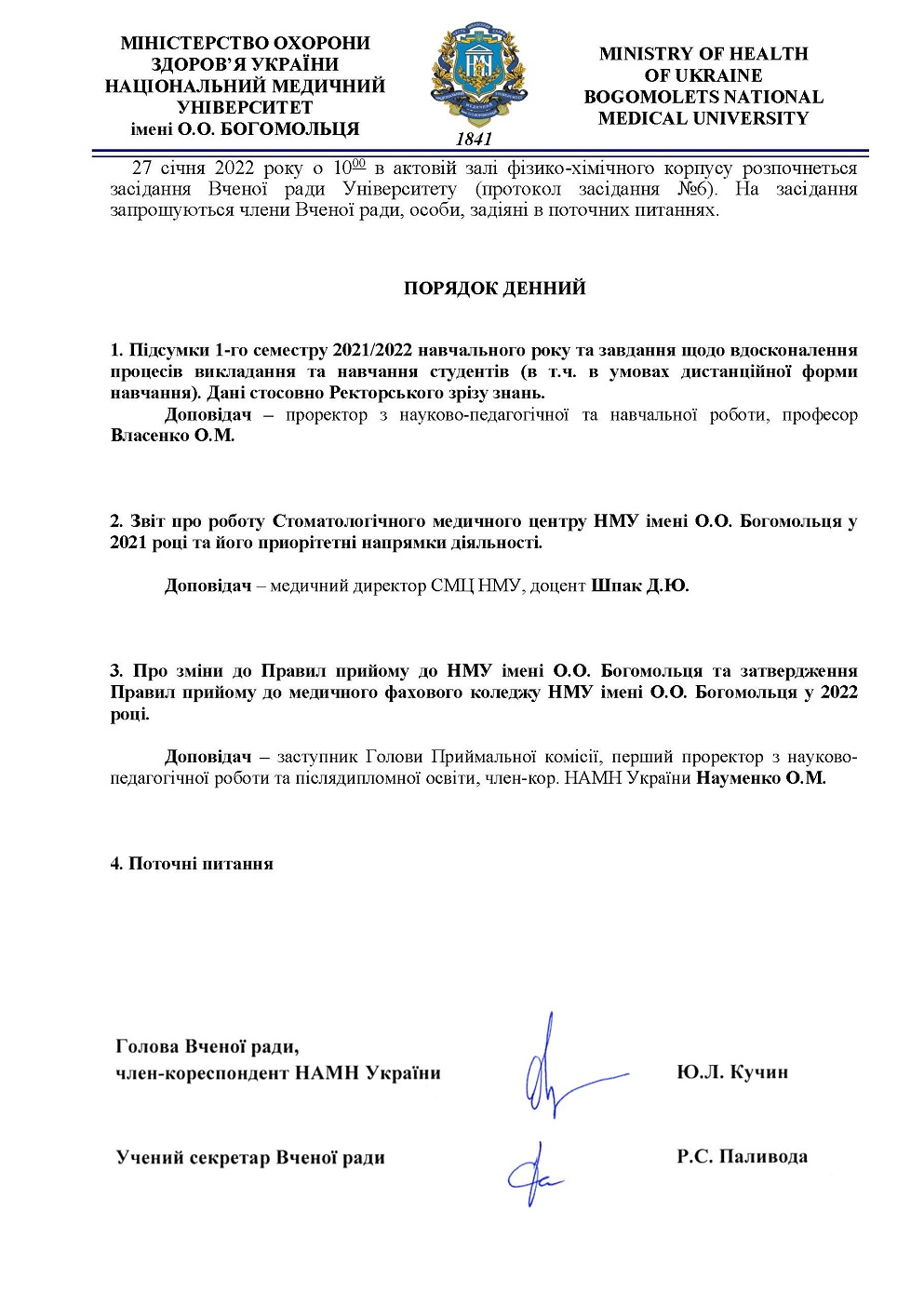 Порядок денний засідання Вченої ради від 27 січня 2022 року